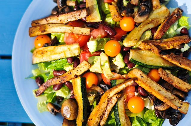 Jag la upp en bädd av romansallad, sedan hackade jag en egen solmogen tomat, strödde över lite kidneybönor och avokado.